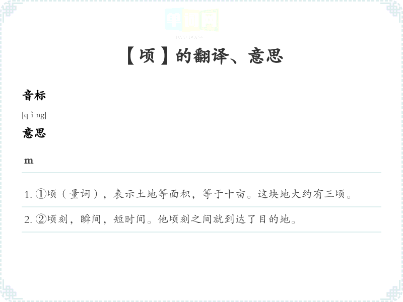 ①顷(量词),表示土地等面积,等于十亩。这块地大约有三顷。