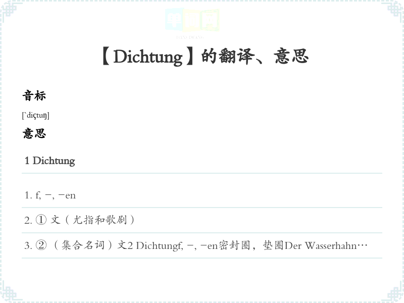 ② (集合名词)文2 Dichtungf, -, -en密封圈,垫圈Der Wasserhahn tropft, weil die Dichtung kaputt ist.水龙头滴水,是因为密封圈坏了。