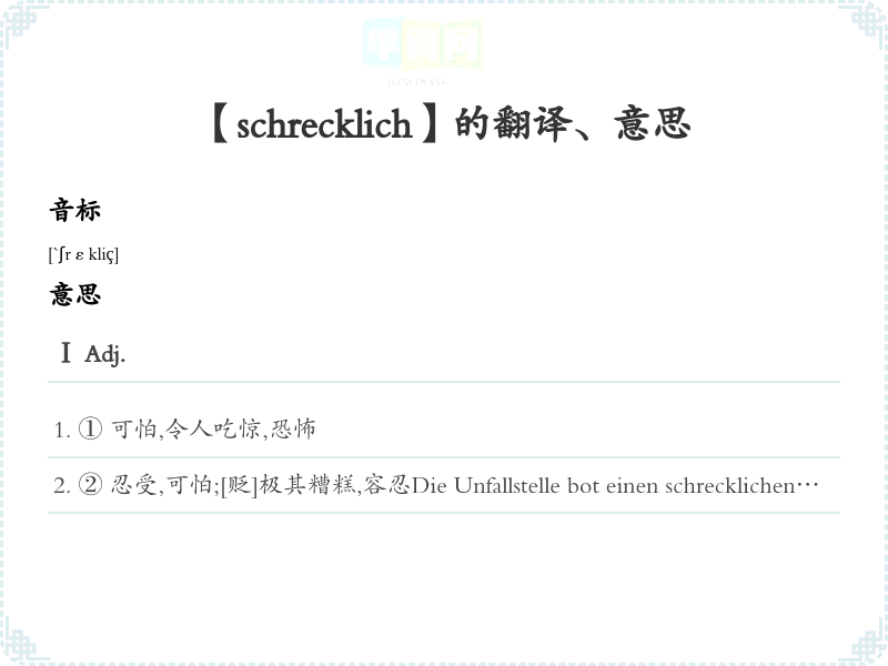 ② 忍受,可怕;[贬]极其糟糕,容忍Die Unfallstelle bot einen schrecklichen Anblick. 出事地点呈现一片可怕景象。Ⅱ Adv.非常地,很Ich freue mich schrecklich darauf. 为对此高兴得得了。