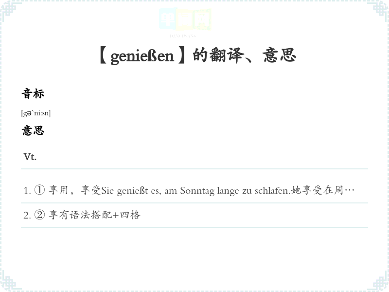 ① 享用,享受Sie genießt es, am Sonntag lange zu schlafen.她享受在周久。Sie genießt das Essen.她享用美味。