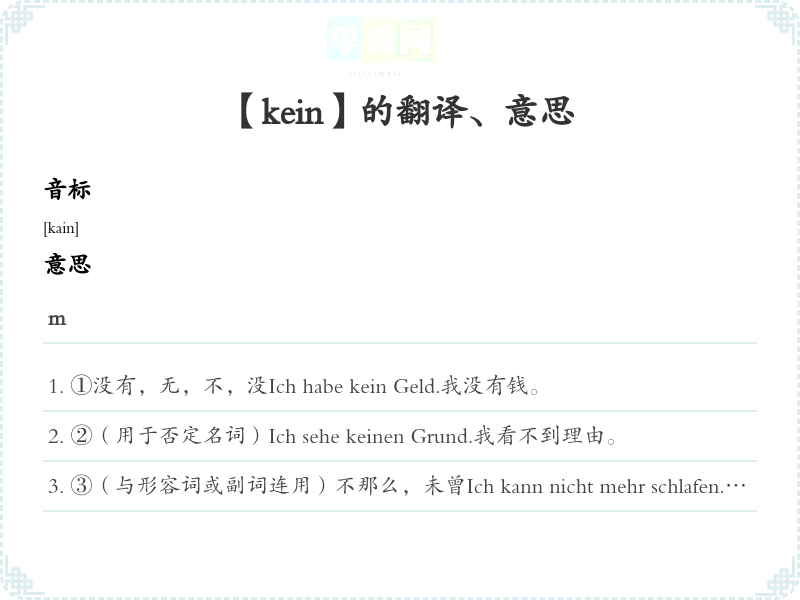 ①没有,无,不,没Ich habe kein Geld.我没有钱。