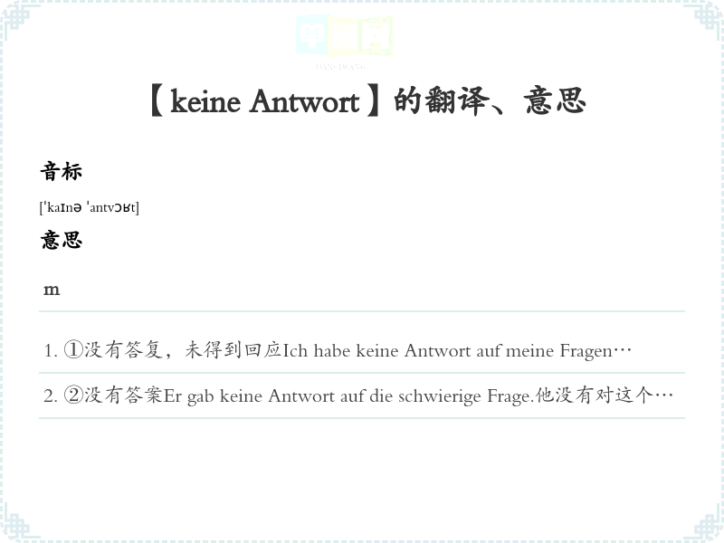 ②没有答案Er gab keine Antwort auf die schwierige Frage.他没有对这个难题给出答案。