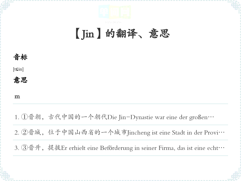 ①晋朝,古代中国的一个朝代Die Jin-Dynastie war eine der großen Dynastien in der Geschichte Chinas.