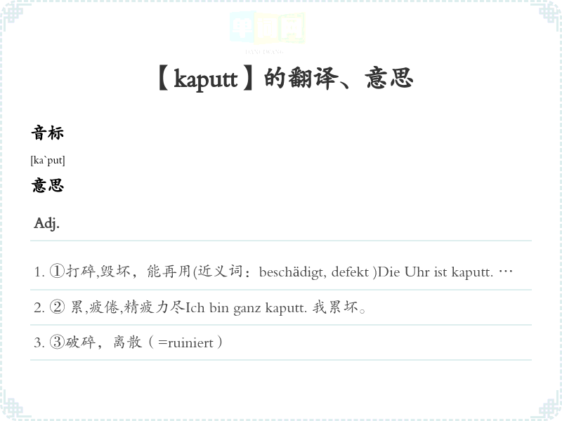 ①打碎,毁坏,能再用(近义词:beschädigt, defekt )Die Uhr ist kaputt. 钟坏。Die Firma ist kaputt. 公司破产。