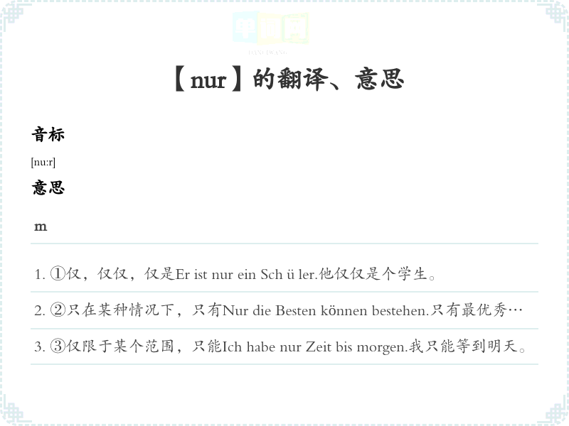 ①仅,仅仅,仅是Er ist nur ein Schüler.他仅仅是个学生。