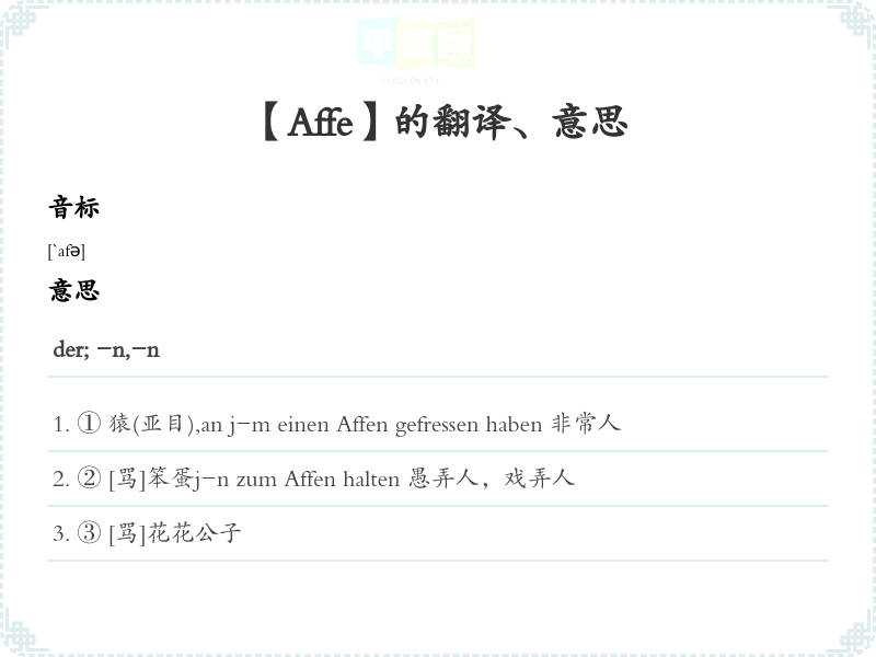 ④ 醉,醉意einen Affen (sitzen) haben [口]喝醉了,喝得醉醺醺的sich(D) einen Affen kaufen/antrinken [口](蓄意)喝醉酒