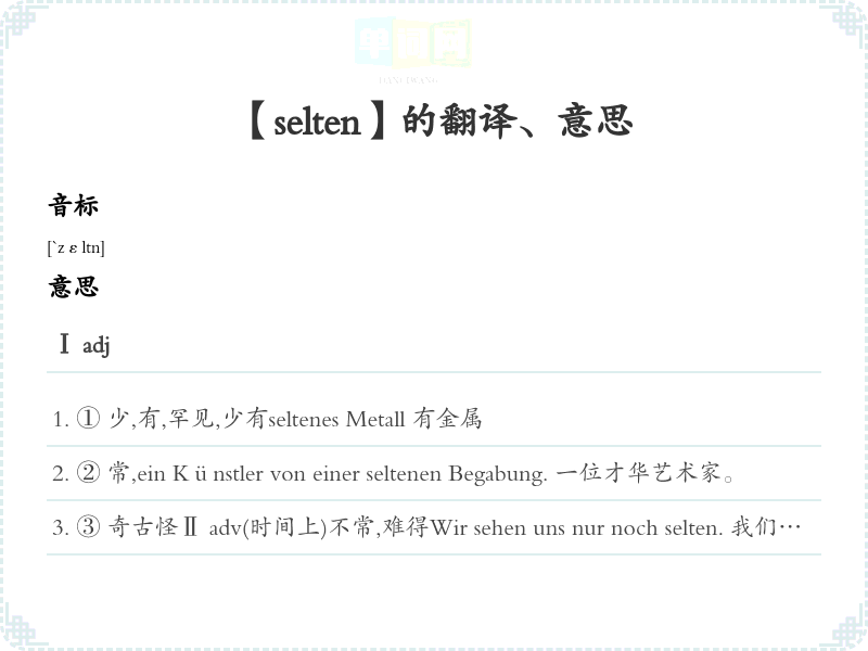 ③ 奇古怪Ⅱ adv(时间上)不常,难得Wir sehen uns nur noch selten. 我们现在很少见面。