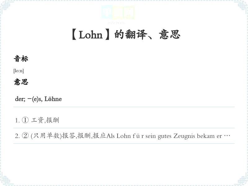 ② (只用单数)报答,报酬,报应Als Lohn für sein gutes Zeugnis bekam er ein Fahrrad.他得到一辆自车作对他优异成绩回报。Eine Ohrfeige war der Lohn für seine Frechheit.一记耳光对他放肆惩。