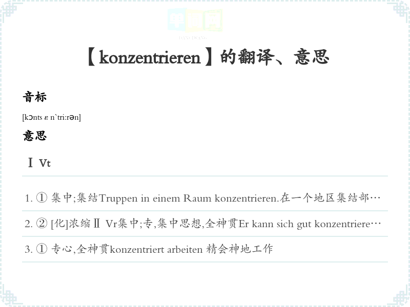 ② [化]浓缩Ⅱ Vr集中;专,集中思想,全神贯Er kann sich gut konzentrieren.他很能集中意力。Ⅲ konzentriert (P.Ⅱ)