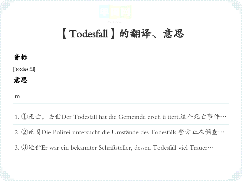 ①死亡,去世Der Todesfall hat die Gemeinde erschüttert.这个死亡事件震惊了社区。