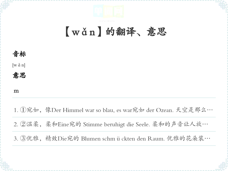 ②温柔,柔和Eine宛的 Stimme beruhigt die Seele. 柔和的声音让人放松。