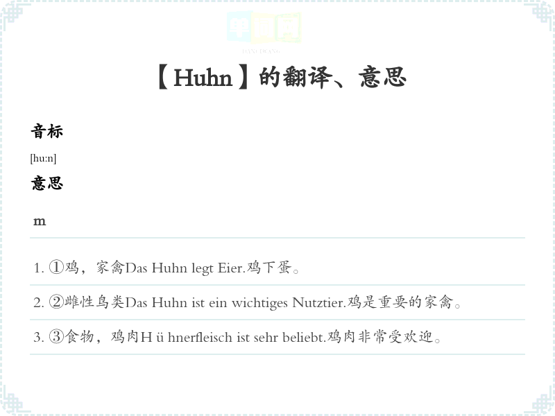 ①鸡,家禽Das Huhn legt Eier.鸡下蛋。