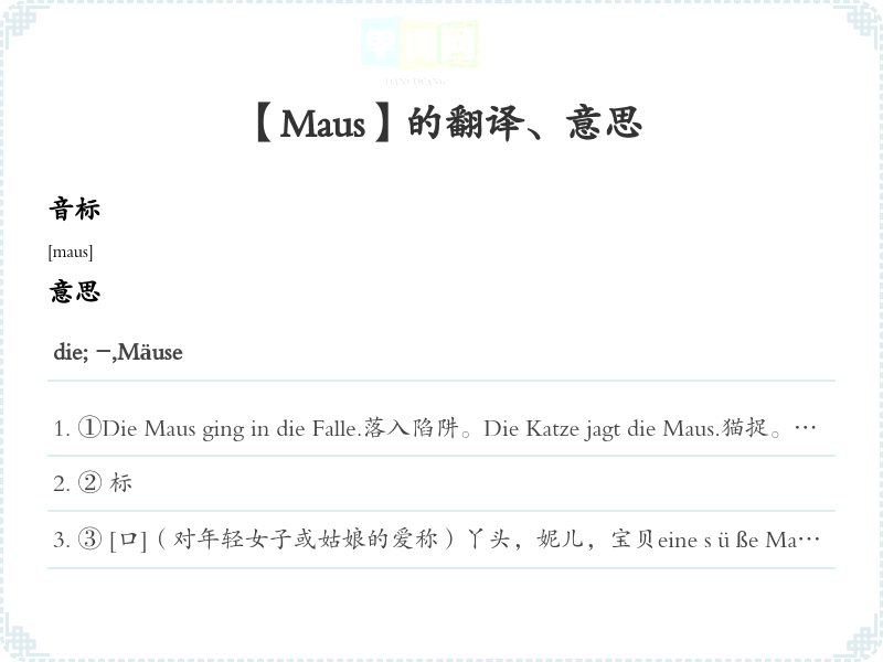 ③ [口](对年轻女子或姑娘的爱称)丫头,妮儿,宝贝eine süße Maus 惹人喜欢的女孩