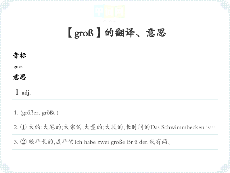 ① 大的;大笔的;大宗的,大量的;大段的,长时间的Das Schwimmbecken ist 250m² groß.泳池有250平米大。Mein Bruder ist einen Meter achtzig groß.我兄弟身高一米八。Der große Zeiger der Uhr zeigt die Minuten an, der kleine die Stunden.长针指示钟,短针指示小时。Der Elefant ist ein großes Tier.大象是一种很大的动物。