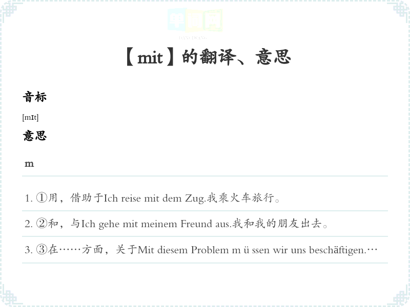 ①用,借助于Ich reise mit dem Zug.我乘火车旅行。