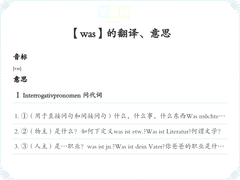 ⑤…样的?Was für ein/eine+ 名词Was für ein Wein möchtest du?你想要什么样的葡萄酒?Ⅱ Interjektion[](表示惊讶)什么!怎么!Was, das weißt du noch nicht?什么,你还不知道啊!ach was!什么乱七八糟的,什么呀(意为不信)Ⅲ Relativpronomen(关系代词)