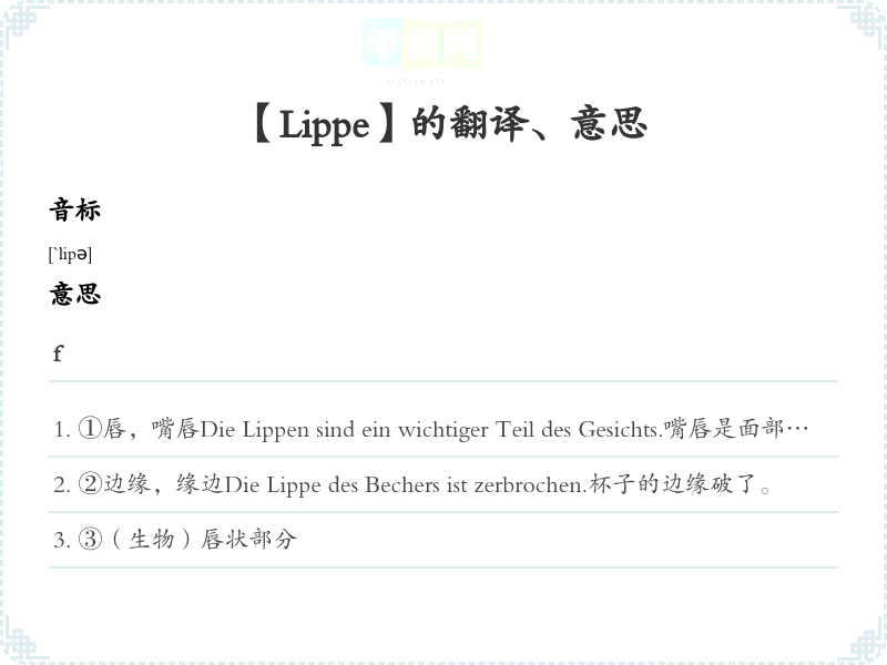 ①唇,嘴唇Die Lippen sind ein wichtiger Teil des Gesichts.嘴唇是面部的重要组成部分。