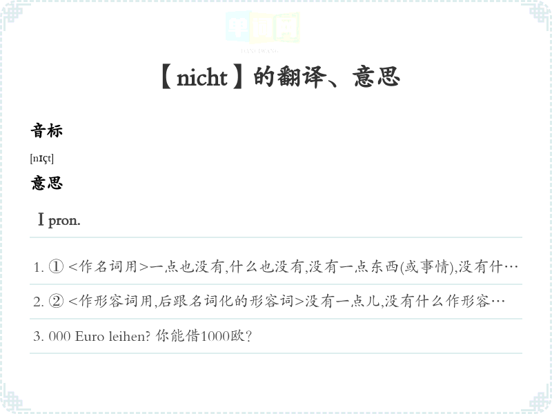 ② <作形容词用,后跟名词化的形容词>没有一点儿,没有什么作形容词用,后跟名词化的形容词>Ⅱ adv.,没有Ich weiß nicht. 知道。nicht öffentlich 非公开nicht [ein]mal 连...也nicht mehr 再Bitte nicht! 请别这样。Ⅲ Partikel...?是?Sie schuldet dir doch noch Geld, nicht? 她欠你钱,对吧?Kannst du mir nicht