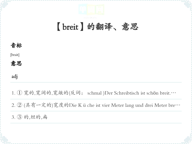 ① 宽的,宽阔的,宽敞的(反词: schmal )Der Schreibtisch ist schön breit.这张写字桌很宽。
