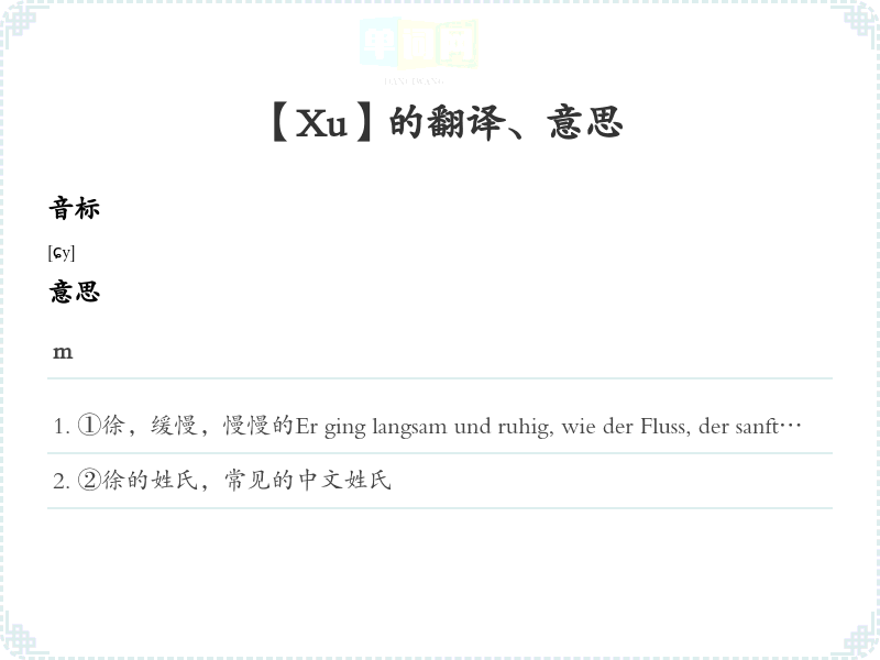 ①徐,缓慢,慢慢的Er ging langsam und ruhig, wie der Fluss, der sanft fließt.他走得慢而稳定,就像缓缓流动的河流。