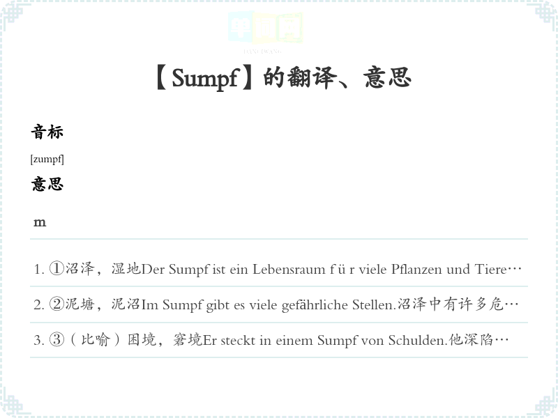 ②泥塘,泥沼Im Sumpf gibt es viele gefährliche Stellen.沼泽中有许多危险的地方。
