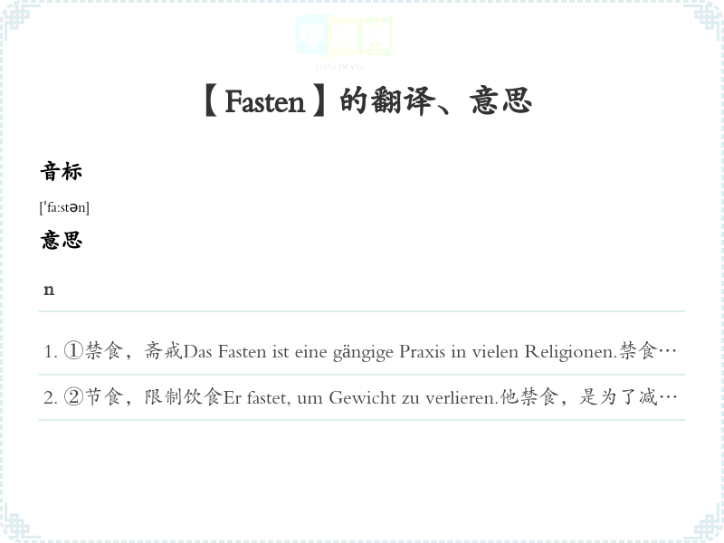 ①禁食,斋戒Das Fasten ist eine gängige Praxis in vielen Religionen.禁食在许多宗教中是一种普遍的做法。