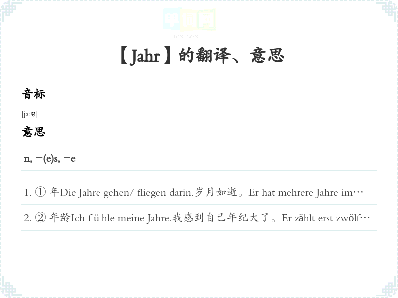 ② 年龄Ich fühle meine Jahre.我感到自己年纪大了。Er zählt erst zwölf Jahre.他才十二岁。
