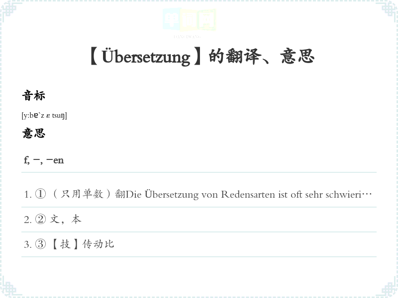 ① (只用单数)翻Die Übersetzung von Redensarten ist oft sehr schwierig.翻习惯用语常常是很难的。