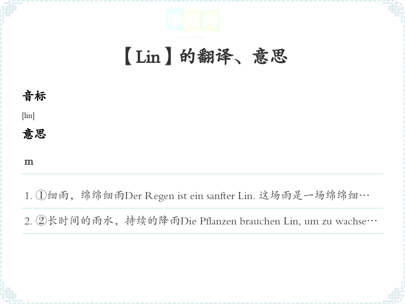 ②长时间的雨水,持续的降雨Die Pflanzen brauchen Lin, um zu wachsen. 植物需要霖才能生长。