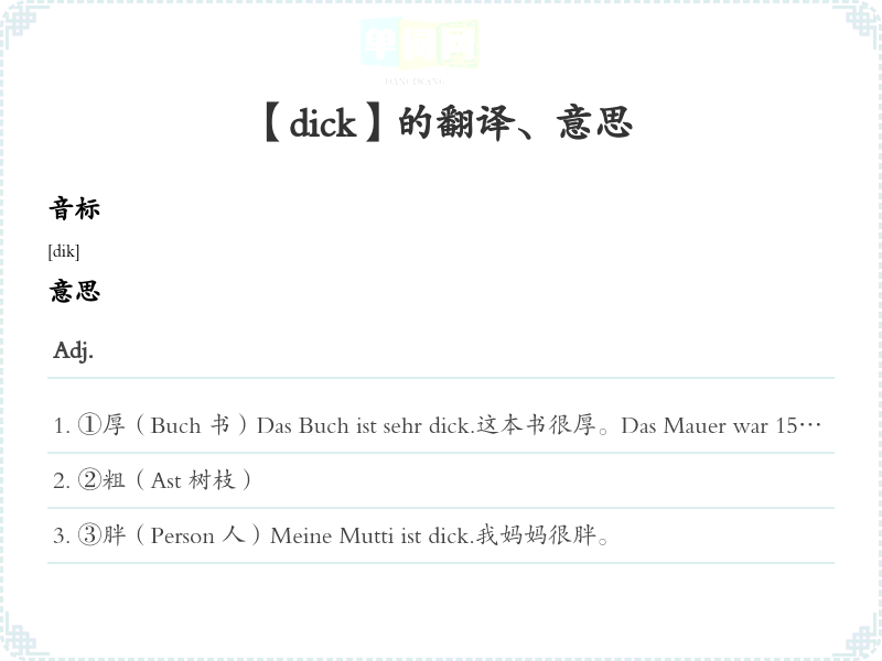 ①厚(Buch 书)Das Buch ist sehr dick.这本书很厚。Das Mauer war 15 cm dick.这墙厚15厘米。
