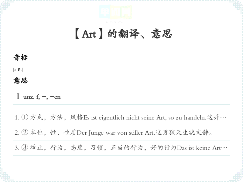 ① 方式,方法,风格Es ist eigentlich nicht seine Art, so zu handeln.这并不是他的一贯做法。