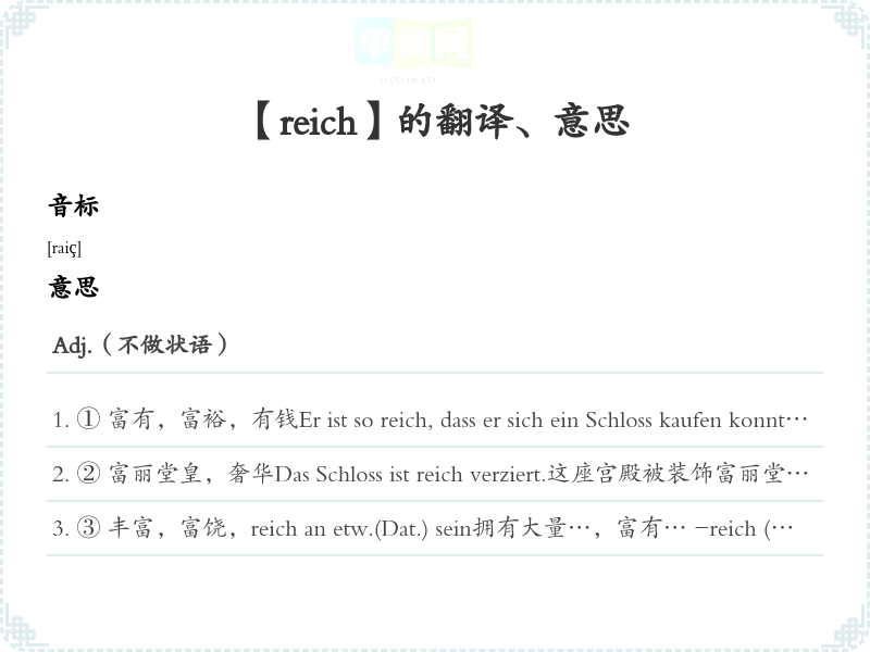 ③ 丰富,富饶,reich an etw.(Dat.) sein拥有大量…,富有… -reich (做后缀,构成形容词)(含)…,…丰富vitaminreich维生素丰富schneereich雪