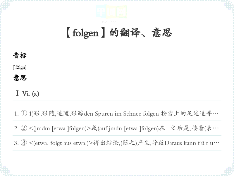 ③ <(etwa. folgt aus etwa.)>得出结论,(随之)产生,导致Daraus kann für uns nur eines folgen. 从中我们只能得出一个结论。Ⅱ Vi. (h.)听从,听(某人的)话Die Kinder haben der Mutter gut gefolgt. 子们很听母亲的话。Ⅲ folgend P.Ⅰ紧接着的,以下的,如下的Ich möchte dazu Folgendes sagen. 对此我想作下列说明。语法搭配+三格, mit+三格, auf+四格, nach+三格, aus+三格
