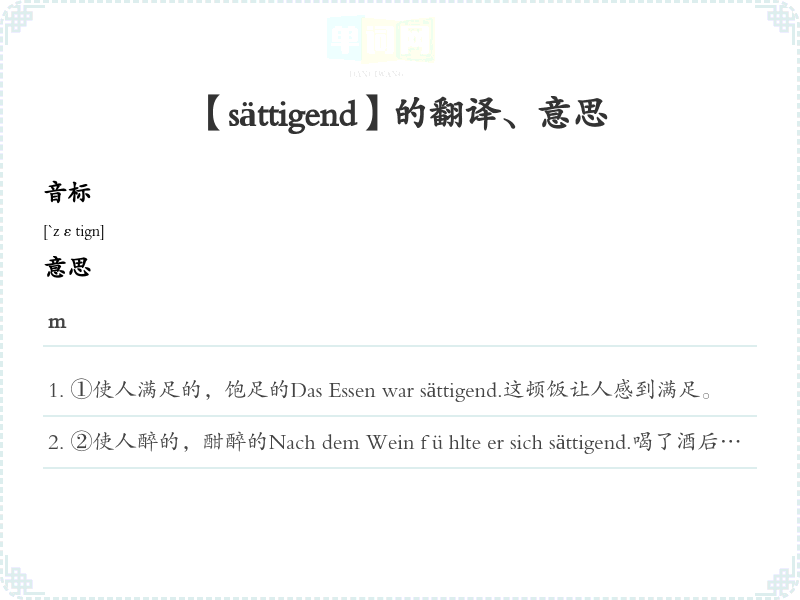 ①使人满足的,饱足的Das Essen war sättigend.这顿饭让人感到满足。