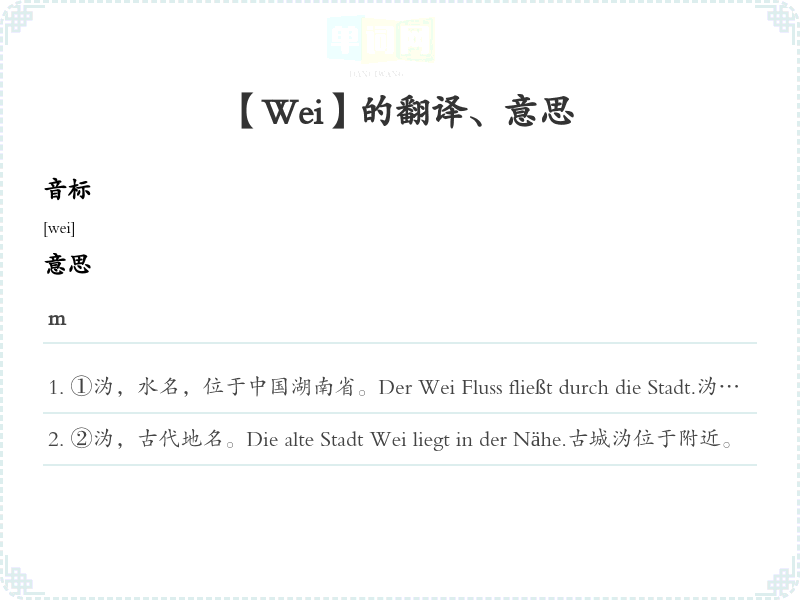 ①沩,水名,位于中国湖南省。Der Wei Fluss fließt durch die Stadt.沩水流经这座城市。