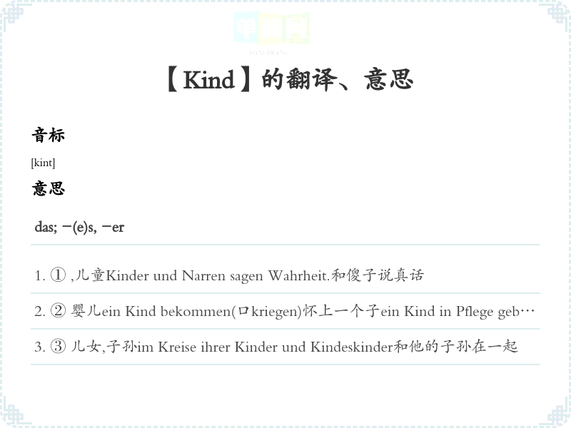 ② 婴儿ein Kind bekommen(口kriegen)怀上一个子ein Kind in Pflege geben把子寄养在外(或托人照管)