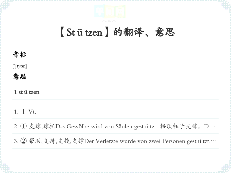 ① 支撑,撑托Das Gewölbe wird von Säulen gestützt. 拱顶柱子支撑。Du sollst die Ellenbogen nicht auf den Tisch stützen. 你不要把两肘撑在桌上。