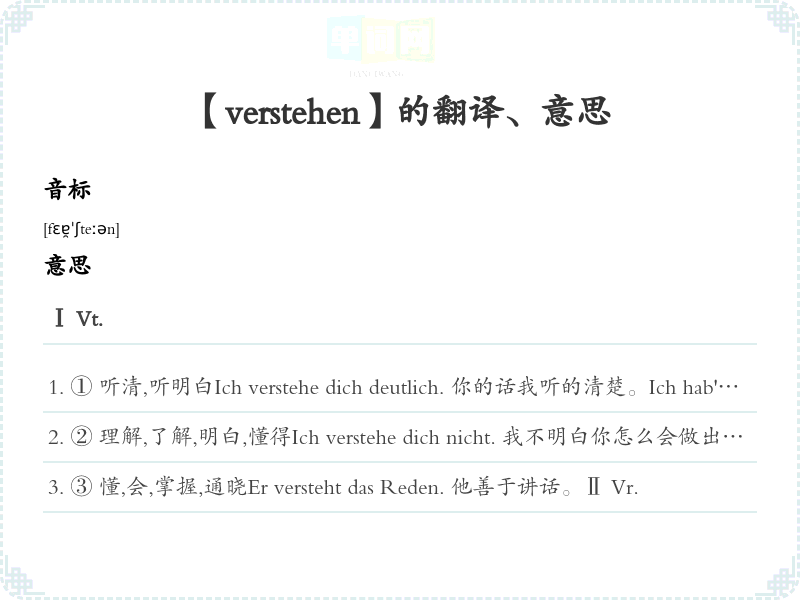 ① 听清,听明白Ich verstehe dich deutlich. 你的话我听的清楚。Ich hab' kein Wort verstanden.我一个字都没听懂。