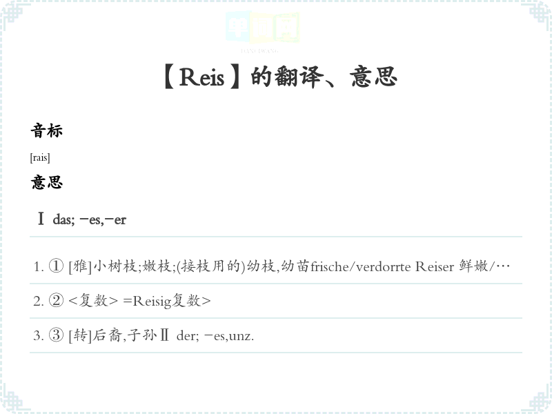 ① [雅]小树枝;嫩枝;(接枝用的)幼枝,幼苗frische/verdorrte Reiser 鲜嫩/干枯的小树枝ein Bündel Reiser 一束枯枝Viele Reiser machen einen Besen. [谚]集枝成帚。