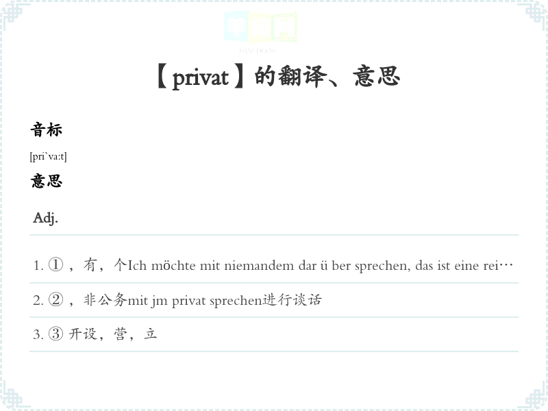 ① ,有,个Ich möchte mit niemandem darüber sprechen, das ist eine rein private Sache.我不想和任何讲这件事,这纯粹是一件事。