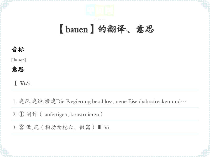 建筑,建造,修建Die Regierung beschloss, neue Eisenbahnstrecken und Autobahnen zu bauen.政府决定修建新的铁路线公路。Ⅱ Vt