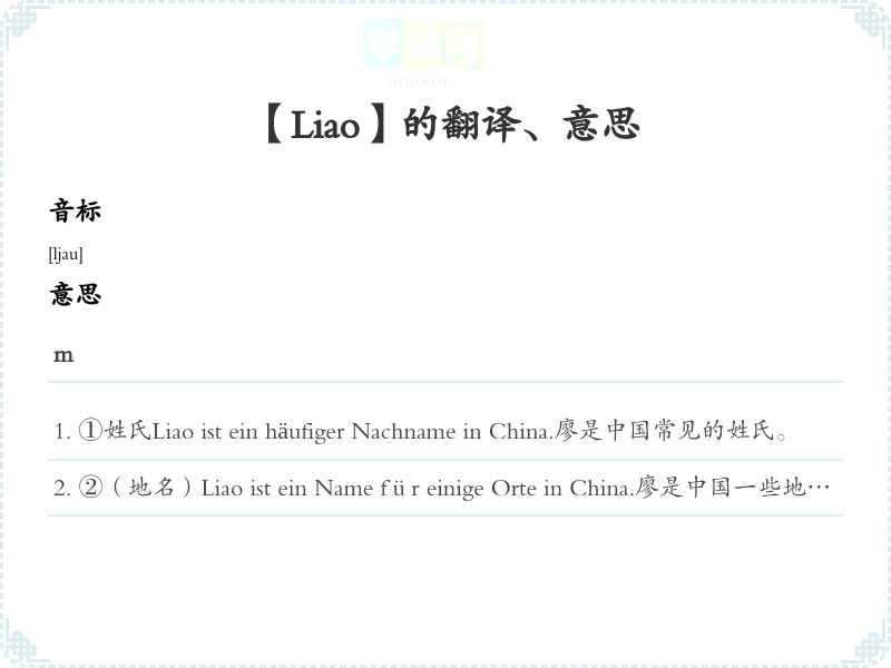 ①姓氏Liao ist ein häufiger Nachname in China.廖是中国常见的姓氏。