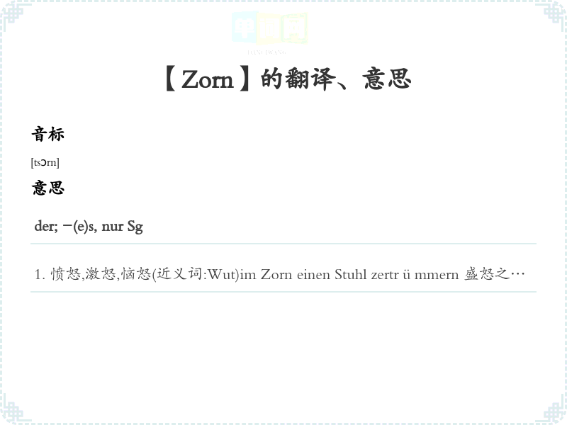 愤怒,激怒,恼怒(近义词:Wut)im Zorn einen Stuhl zertrümmern 盛怒之下把椅子摔碎