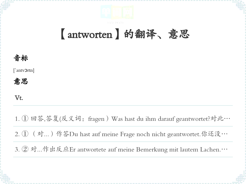 ① 回答,答复(反义词:fragen)Was hast du ihm darauf geantwortet?对此你是怎么回答他的?Vi.