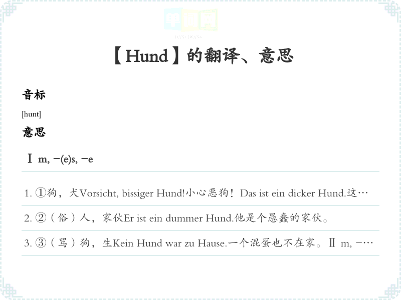 ①狗,犬Vorsicht, bissiger Hund!小心恶狗!Das ist ein dicker Hund.这是件荒唐无耻的事。Hunde, die viel bellen, beissen nicht.好叫的狗不咬人。(易怒的人不可怕)(谚)