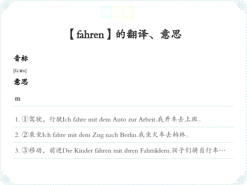 ①驾驶,行驶Ich fahre mit dem Auto zur Arbeit.我开车去上班。