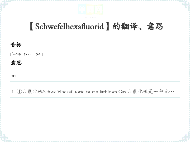 ①六氟化硫Schwefelhexafluorid ist ein farbloses Gas.六氟化硫是一种无色气体。
