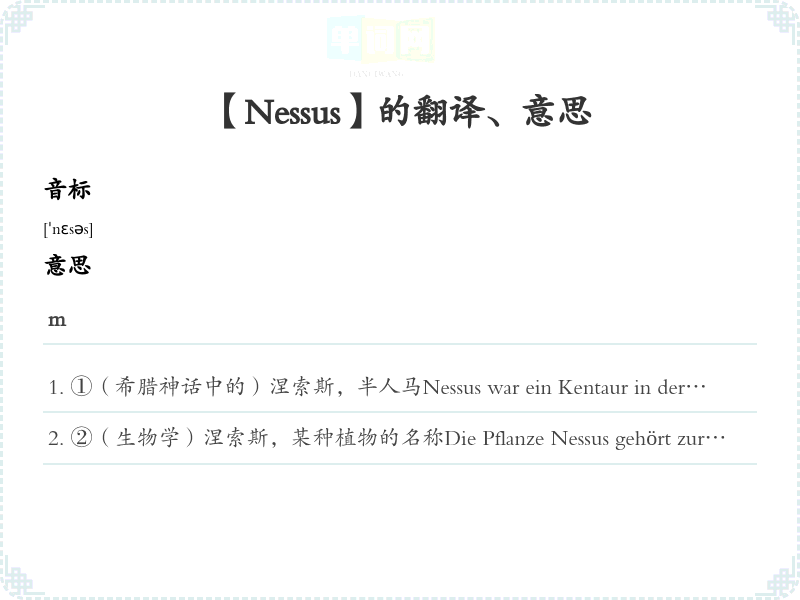 ②(生物学)涅索斯,某种植物的名称Die Pflanze Nessus gehört zur Familie der Wasserpflanzen.
