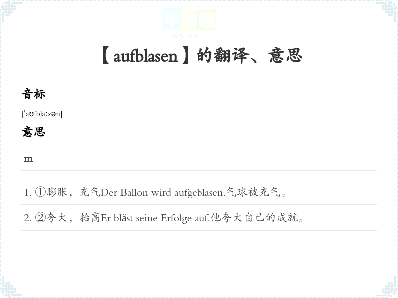 ②夸大,抬高Er bläst seine Erfolge auf.他夸大自己的成就。
