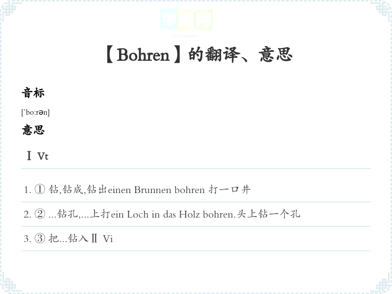 ⑤ 坚持不懈地研究Er bohrte so lange, bis er eine Lösung für dieses Problem fand.他坚持不懈地研究,直到找到了解决这个问题的方法。Ⅲ Vr钻进,穿入,刺入,深入Der Nagel bohrte sich durch die Sohle.钉子扎进了鞋底。语法搭sich+四格, +四格, in+三格, in+四格, nach+三格, durch+四格